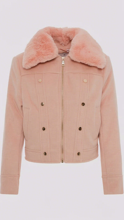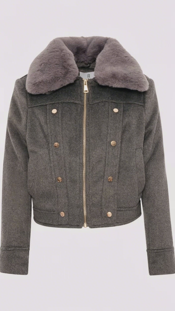 Il design combina elementi classici del bomber con dettagli sartoriali, come il taglio corto e la vestibilità boxy. Il pezzo forte è il morbido collo in pelliccia sintetica grigio che aggiunge un tocco di lusso e calore. La chiusura frontale è una pratica cerniera dorata a doppio cursore, che garantisce funzionalità e un tocco luminoso. Quattro bottoni decorativi dorati, posti a coppie sul davanti, richiamano uno stile militare e arricchiscono il design.